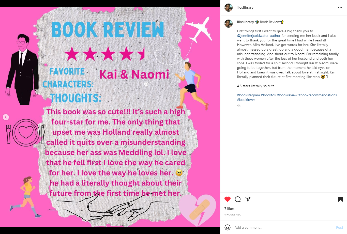 First things first I want to give a big thank you to @jenniferjcoldwater_author for sending me her book and I also want to thank you for the great time I had while I read it! However, Miss Holland, I’ve got words for her. She literally almost messed up a great job and a good man because of a misunderstanding. And shout out to Naomi For remaining family with these women after the loss of her husband and both her sons. I was fooled for a split second I thought Kai & Naomi were going to be together, but from the moment he laid eyes on Holland and knew it was over. Talk about love at first sight, Kai literally planned their future at first meeting like stop 🥺